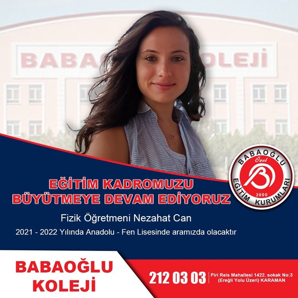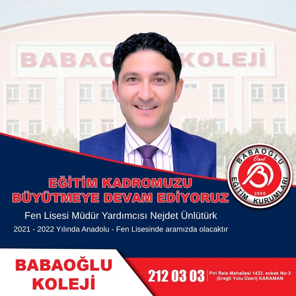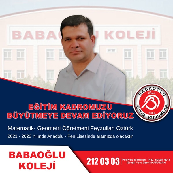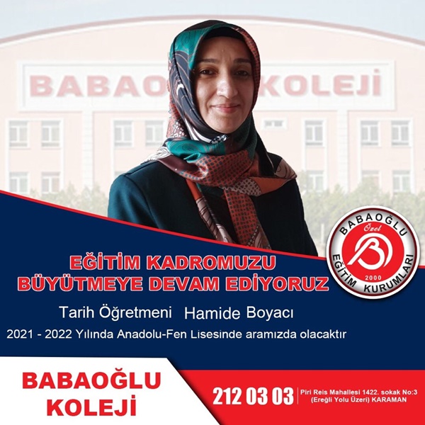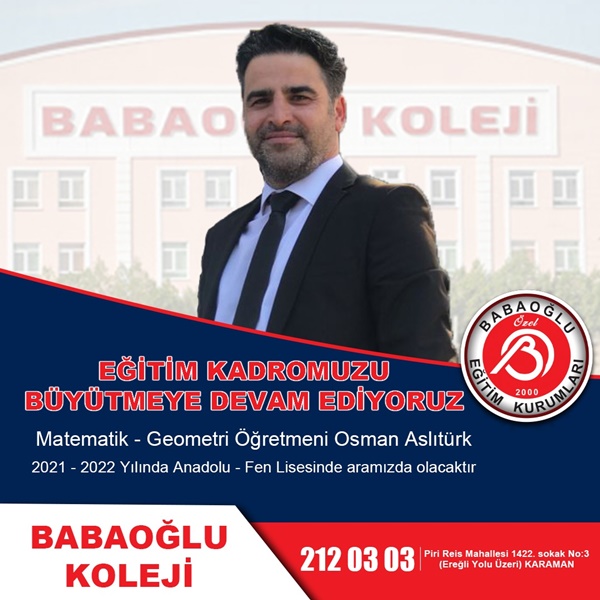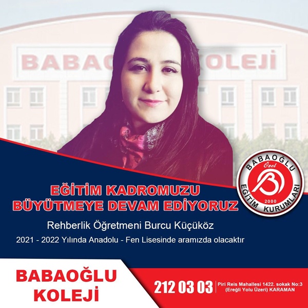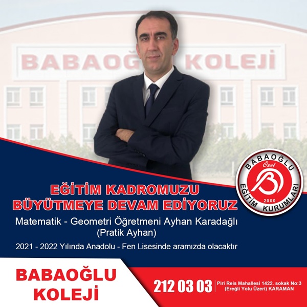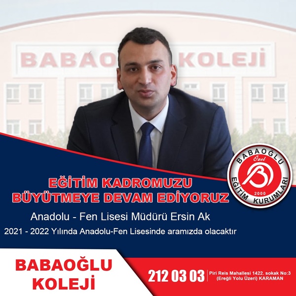 İlimizde 21 yıldır faaliyet gösteren Özel Babaoğlu Eğitim Kurumları, Babaoğlu Fen Lisesi ve Anadolu lisesi olarak kurumsal güvenilirliğini ön planda tutarak adından söz ettirmeye devam ediyor. Karaman’da eğitime katkı sunmaya devam eden Özel Babaoğlu Eğitim Kurumları, eğitim kadrosunu da büyütüyor. Babaoğlu Koleji, alanında uzman, müdür, müdür yardımcısı, rehber öğretmen, özellikle matematik ve tüm branşlarda şehrin marka isimlerini yeni kadrosunu dâhil etti.