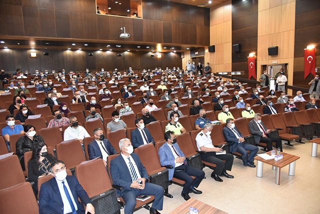 Piri Reis Kültür Merkezinde geniş kapsamlı gerçekleştirilen toplantı, İl Sağlık Müdürlüğünün okul ve yurtların yanı sıra okul servislerinde salgının yayılımının önlenmesine yönelik alınması gereken tedbirleri içeren sunumuyla başladı. Salgınla mücadelenin etkin olarak yürütülmesinde temel alınacak esasların başlıklar halinde aktarıldığı sunumda, temizlik, maske kullanımı, mesafe, okulların havalandırılması, eğitim alanları, okul yemekhanesi ve yatakhanelerinde alınması gereken tedbirler ile birlikte salgını baskılayacak öneriler katılımcılara aktarıldı.