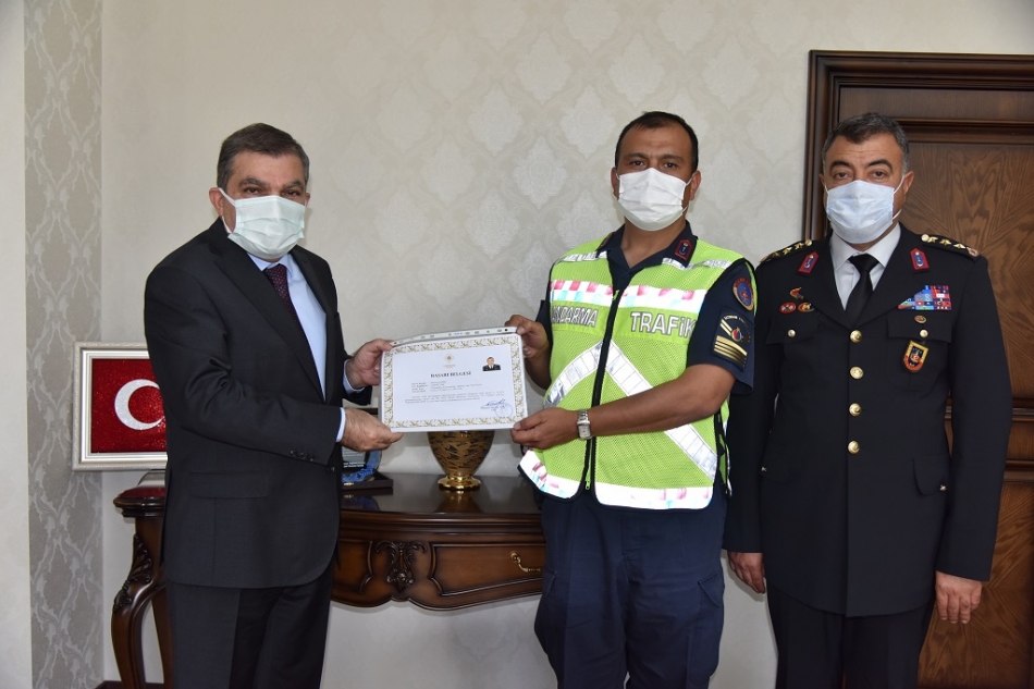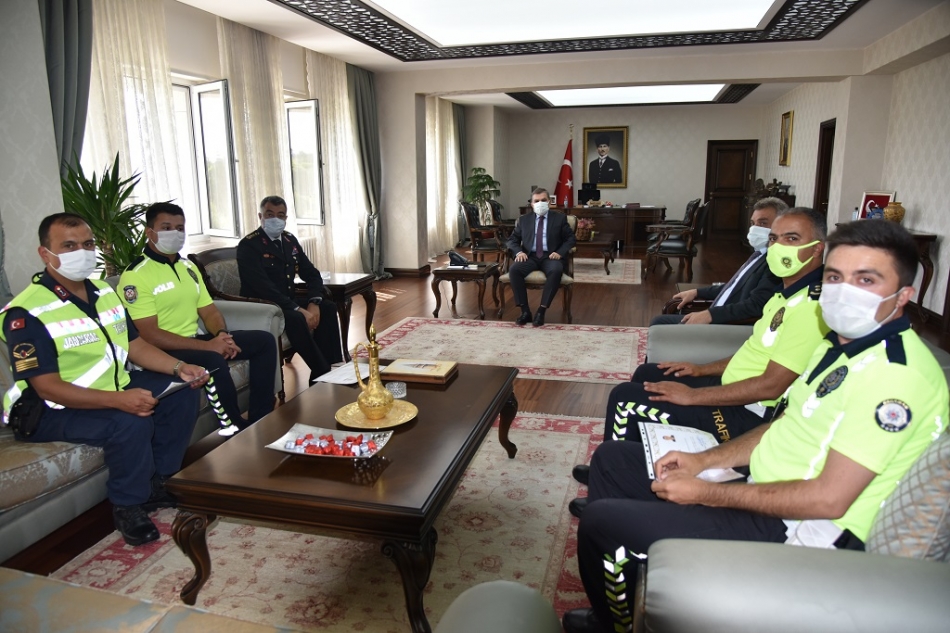 Karaman Valisi Mehmet Alpaslan Işık, trafik güvenliğinin sağlamasında başarılı çalışmalarından dolayı jandarma ve emniyet personellerini tebrik ederek başarı belgesi verdi.