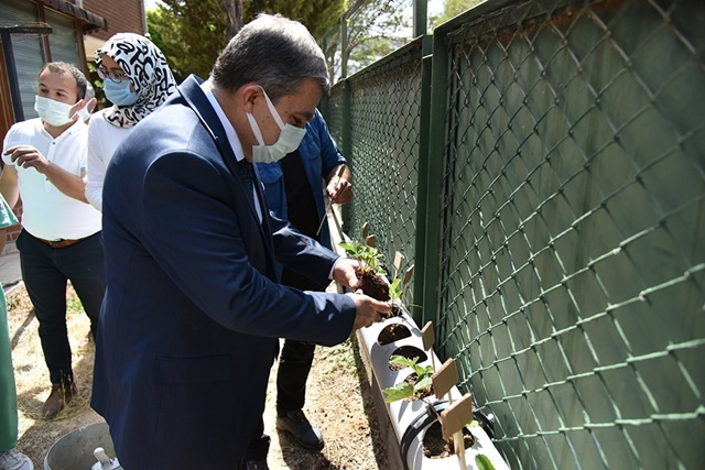 Sevgi evlerinde gerçekleştirilen çilek ekim programı öncesinde dikimi yapılan çileklerin bulunduğu alanda incelemelerde bulunan Vali Mehmet Alpaslan Işık, yetkililerden proje hakkında bilgiler aldı.